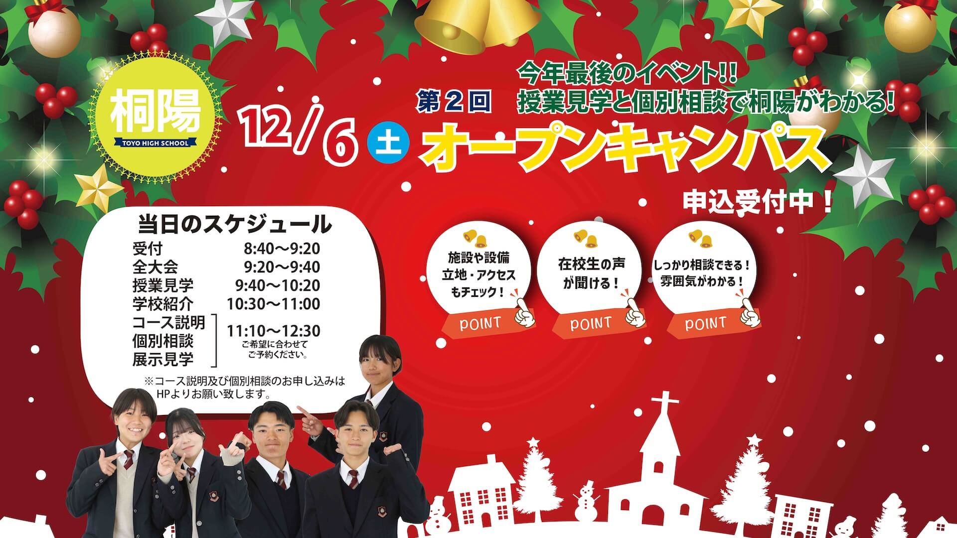 一人ひとりの夢・理想の実現へ向け、きめ細かな指導を通して、最適な進路サポートをしていきます。朝学習や進学講座など、確固とした学力の習得体制も築かれています。