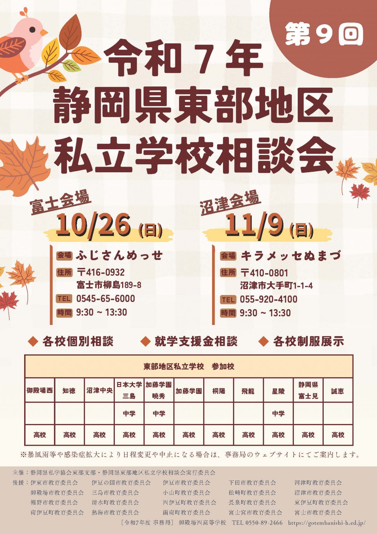東部地区私立学校相談会に出展します 2025 10/09 10/26(日) ふじさんめっせ11/ 9(日) キラメッセぬまづ 上記日程で開催の「静岡県東部地区 私立学校相談会」に出展します。イベントの詳細は、以下の画像をご確認ください お知らせ 入試関係